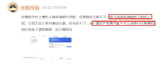 有消费者向黑猫投诉【投诉入口】平台反应,自己在借贷平台申请的贷款无法正常还款,联系出资方的上海华瑞银行得知债务进行了转移,但也没有后续的公司来对接债务。对此,平台称并未接到来自银行方的债务转移通知,此笔贷款只能一直显示逾期且不断累加费用。